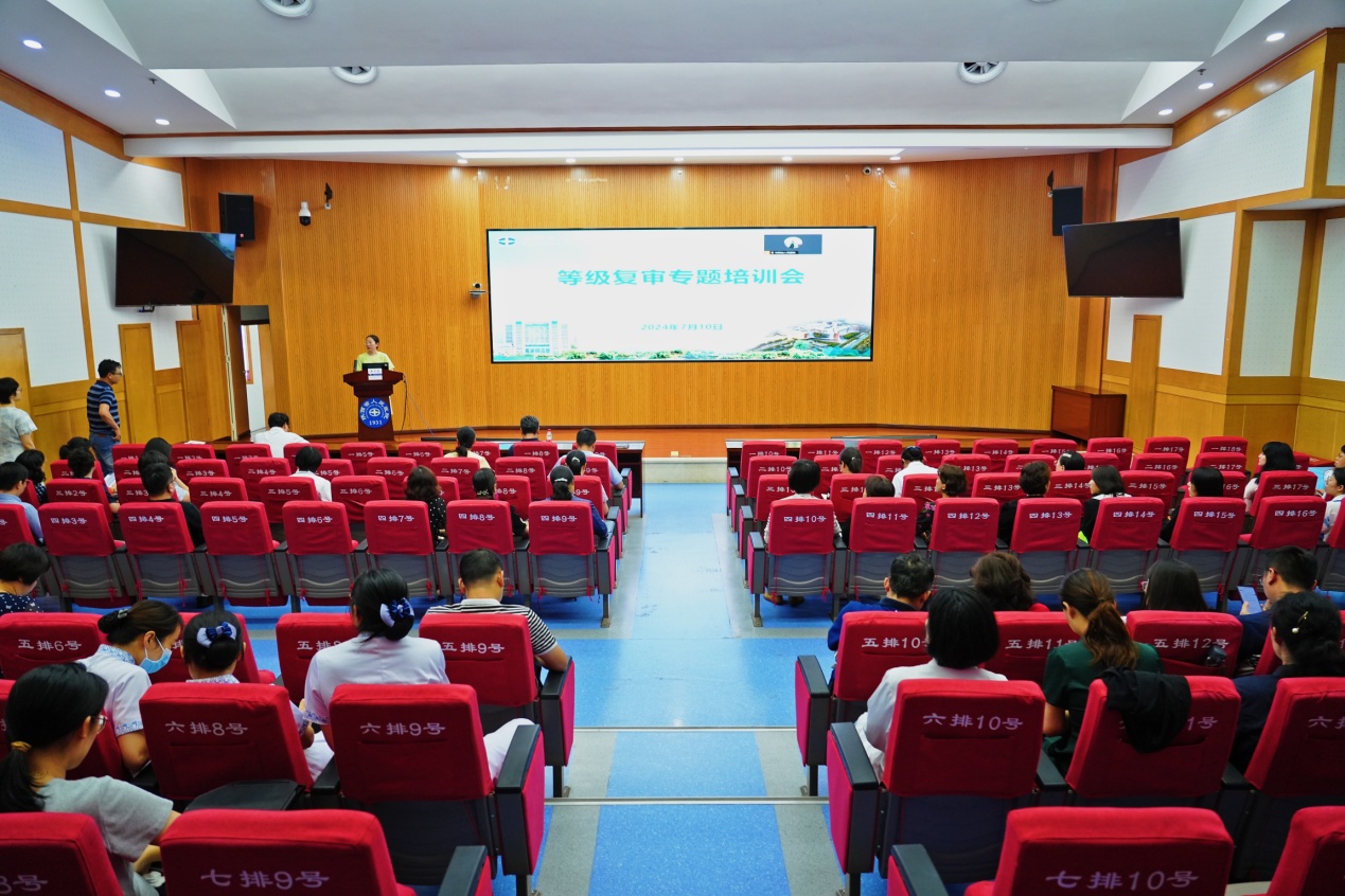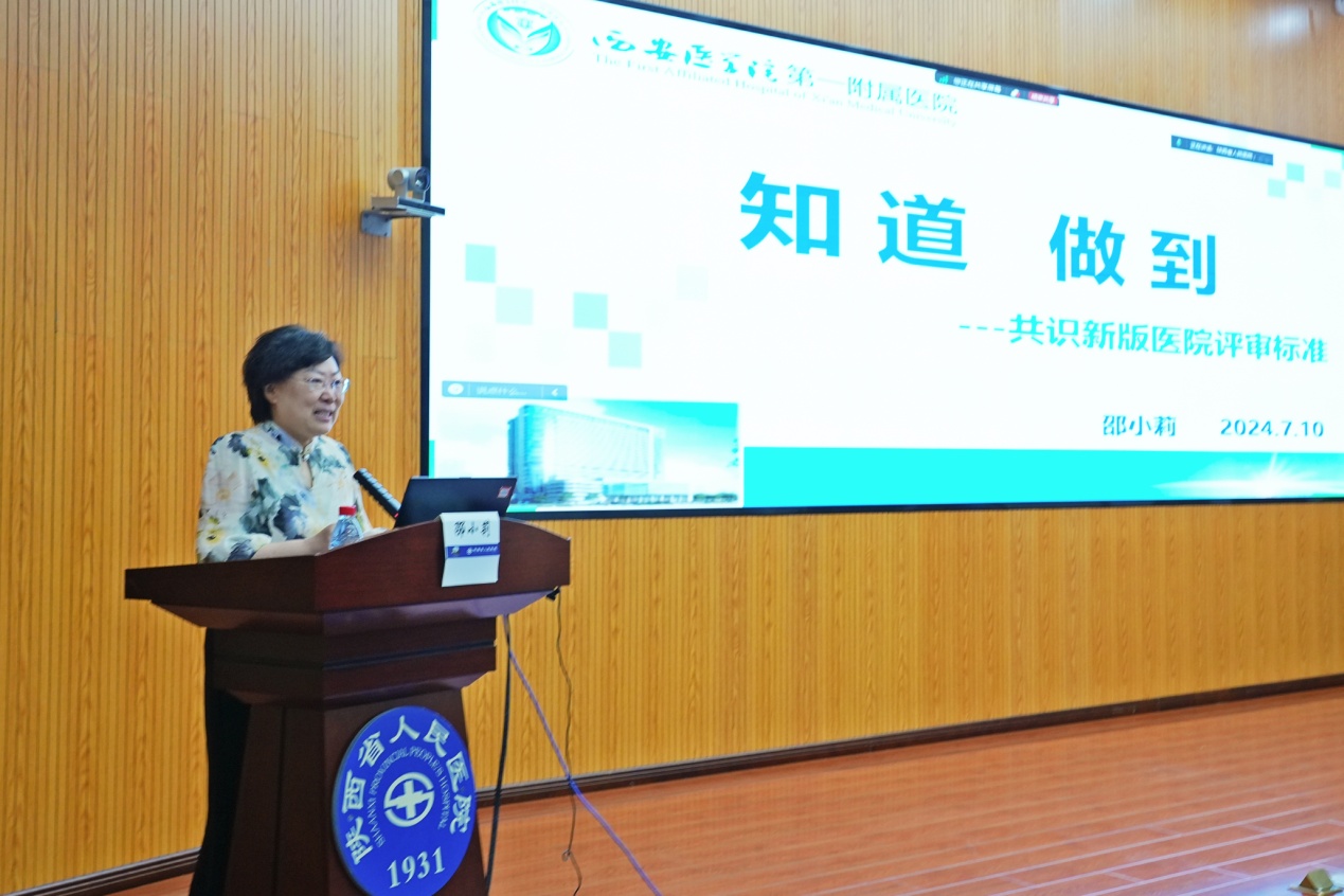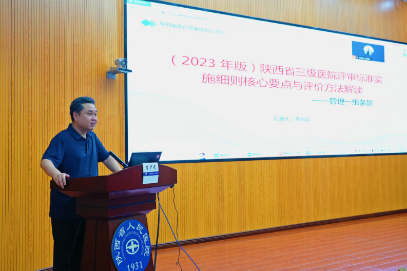 为加强行政管理人员对《陕西省三级医院评审标准实施细则(2023版)》的深刻理解,提升医院等级复审工作的内涵和质量,7月10日下午,等级复审办公室特邀省内医院等级评审专家来院进行《评审中医院管理指标的解读》专题培训。全院行政处室正副处长/主任、正副科长、处长助理、复审联络员,总支书记、总护士长、院内复审专家团队,医务处、院感办、护理部、法务处、门急诊与医技管理处、学科办、预防保健科等业务部门工作人员共计100余人参加。