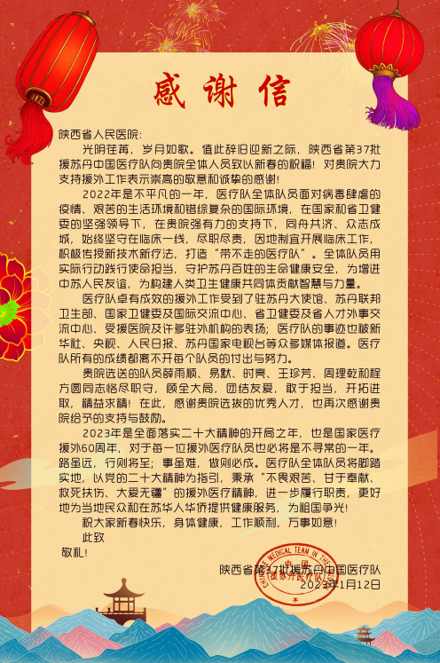 1月12日,陕西省第37批援苏丹中国医疗队向五楼自拍 发来感谢信,感谢医院对援外工作的大力支持及五楼自拍 队员在援外工作中的付出和努力。