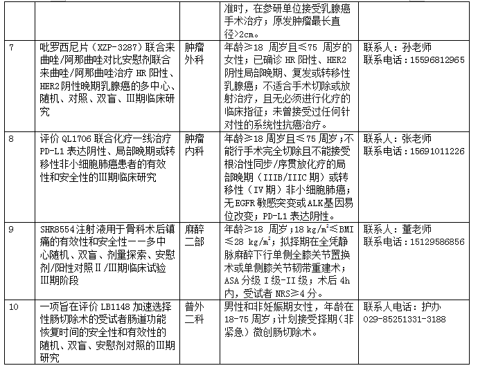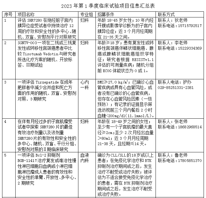 岁序更替,华章日新。2023年开年以来,在医院全面贯彻落实党的二十大精神、贯彻落实全国两会精神,高举医院高质量发展大旗前进之际,在党委书记张玉莲的大力支持,机构主任宋张骏院长的精心指导下,机构办全体员工坚守本职工作,强化管理引导,深化项目宣传,拓展合作渠道,第1季度签署药物临床试验项目10余项,合同经费800余万元。为进一步推进项目进度,加快受试者入组,现将2023年第1季度临床试验项目招募信息汇总如下,有意向参加的患者可来院垂询。五楼自拍 将严格按照GCP规范管理各专业组承担的临床试验项目,通过知情同意、严密随访、信息保密、免费检查、给予补助等措施充分保护受试者的安全和合法权益。