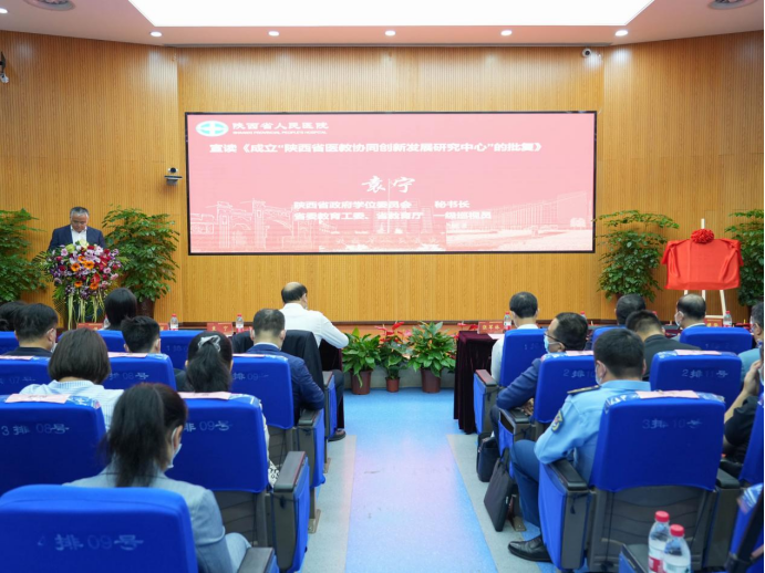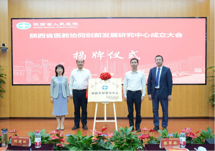 党委书记张玉莲、院长宋张骏共同为中心揭牌。陕西省政府学位委员会秘书长、省委教育工委、省教育厅一级巡视员袁宁宣读《关于成立“陕西省医教协同创新发展研究中心”的批复》文件。