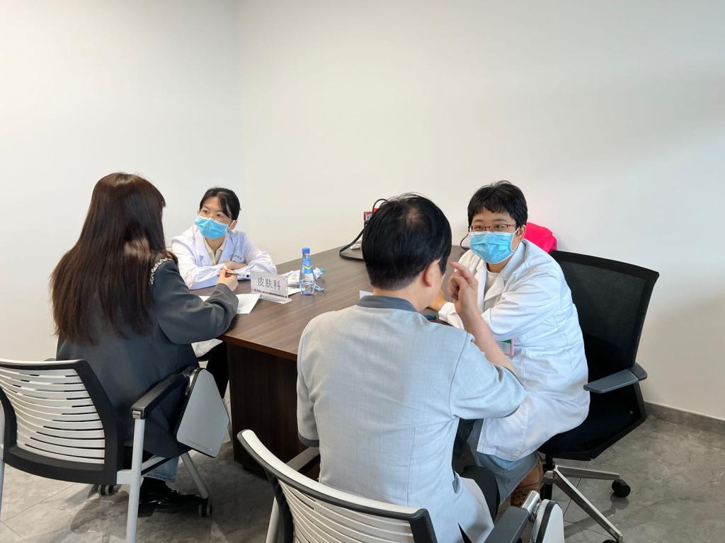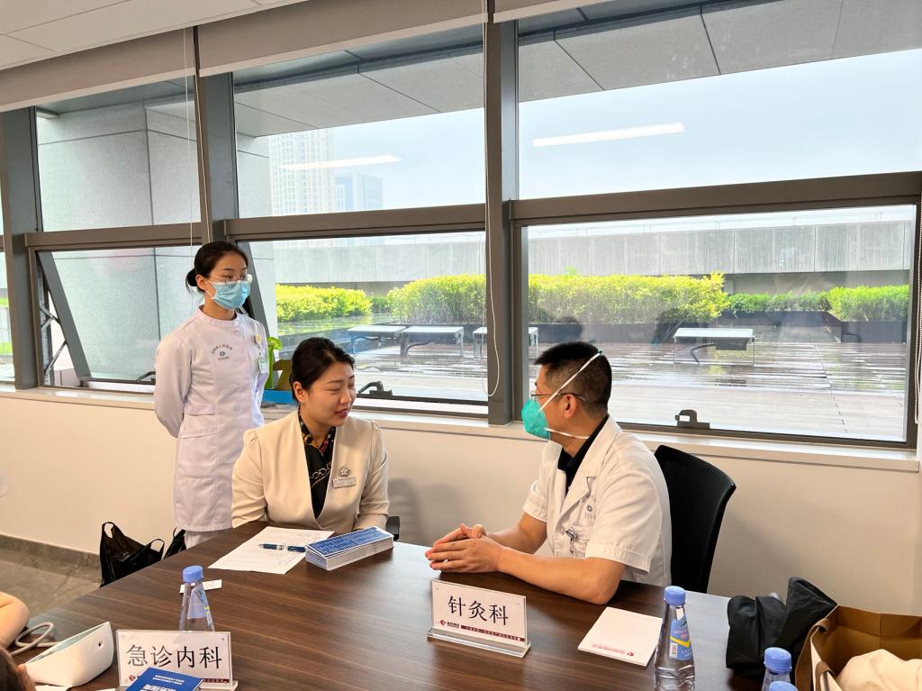 5月26日下午,细雨绵绵,第二临床党总支书记强华带领皮肤科杨励、针灸科张勇,以及眼科、肛肠外科、神经外科、营养科等科室青年骨干医生,走进高新区高科智慧园职工活动中心,开展义诊活动。