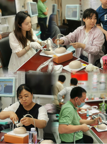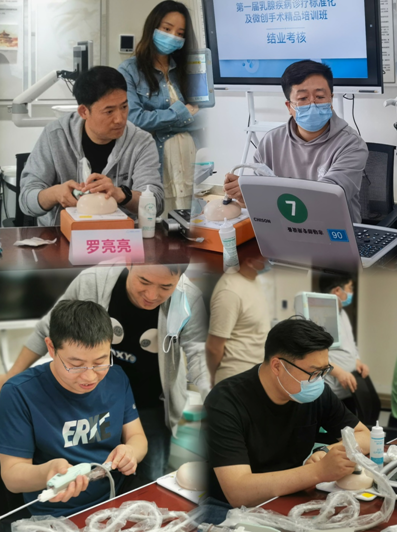 理论授课阶段,肿瘤外科程冲、马刚、祝旭龙、申艳伟、谭苗医师分别对乳腺微创旋切术的临床应用及操作规范、乳腺微创旋切并发症处理、穿刺及旋切是否会引发针道转移、乳腺微创旋切活检确诊恶性病变的临床处理思考、乳腺超声操作规范及临床应用价值等主题进行讲解。授课过程中大家相互讨论,相互切磋,在讨论中掌握更多的理论知识和手术操作细节,汲取更多的新理念和新观点,每一位学员都受益匪浅。