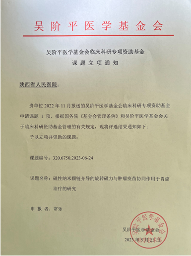 近日,中心实验室常乐博士申请的“磁性纳米链介导的旋转磁力与肿瘤疫苗协同作用于胃癌治疗的研究”项目成功获批吴阶平医学基金会设立的“临床科研专项资助基金”,获资助10万元。