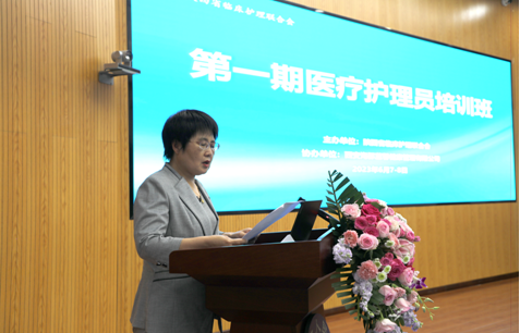陕西省护理联合会副会长吴红娟在开班仪式上致辞,指出本期培训班将帮助学员了解医疗护理员素质要求,掌握健康照护基本知识,熟悉健康照护基本技能,分享临床服务的新经验和新进展,为进一步改善服务、提升质量、保障服务对象安全做出新贡献,助推我省的健康服务事业走上高质量发展道路。西安海豚蓝馨健康管理有限公司总经理王晓红在致辞中认为此次培训班的举办恰逢其时,既是响应国家卫健委发展医疗辅助职业的具体政策,也是顺应民生工程的重要内容,对企业发展也有助推作用。