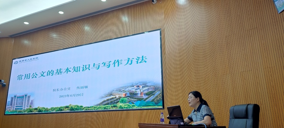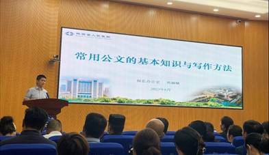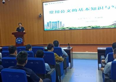 会议第一阶段,张真妮主任首先从“规范优秀的行文是保证各级政令畅通的重要手段,文字能力是行政后勤管理者的基本技能,日常公文代表了管理人员的工作思路及办事能力”三个方面强调了公文写作的重要性,并从“平时多收集资料、多研究范文、大胆下笔、勤加练习”四个方面给予大家中肯、实用的建议。随后焦丽敏主任助理以《常用公文的基本知识与写作方法》为题,从四个方面具体进行讲解,重点对纪要、通知、请示、报告等常用文种深入分析,并分享了自己多年写作的心得和经验。