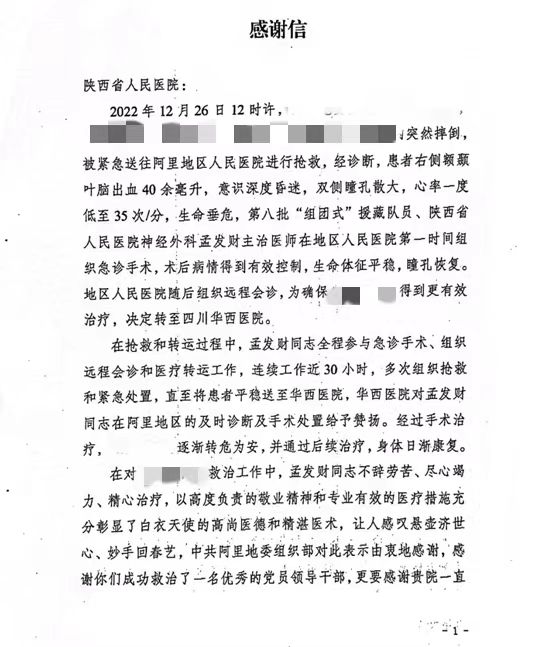 感谢信里记录了孟发财医生在援助阿里期间成功救治一名患者的事迹。他连续工作近30小时,为患者抢时间,与生命赛跑,将患者从死神手中夺回。他尽心竭力的精心治疗,彰显了白衣天使的崇高形象。