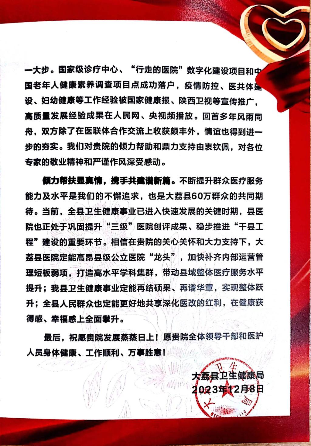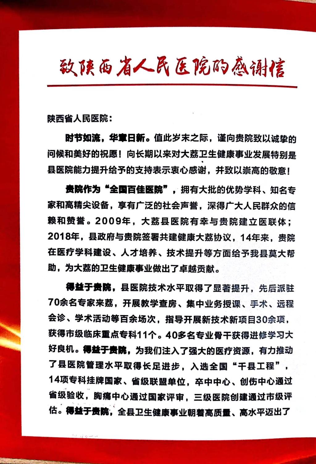 12月8日,大荔县卫健局向五楼自拍 发来感谢信,对五楼自拍 长期以来对大荔卫生健康事业发展特别是县医院能力提升给予的支持表示衷心感谢,感谢信全文如下: