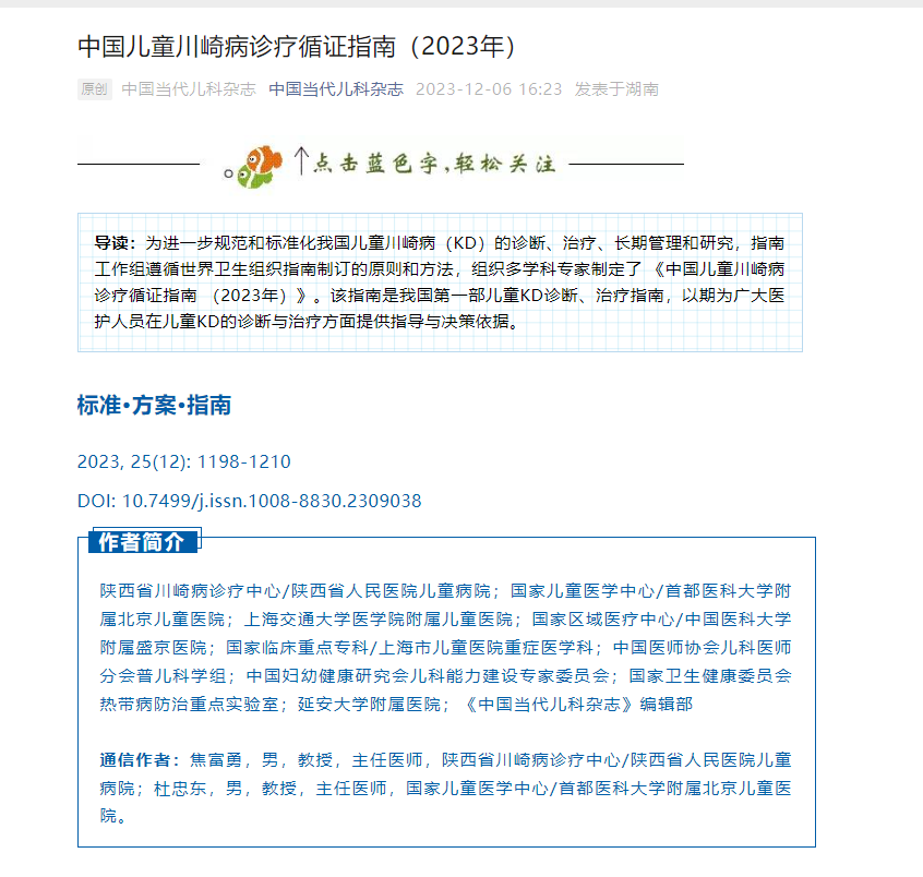 近日,由五楼自拍 儿童病院牵头完成的国内第一部《中国儿童川崎病诊疗循证指南》在《中国当代儿科杂志(CJCP)》发表,截至目前微信阅读量2.3万。