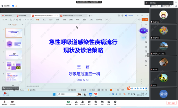 医师对呼吸系统疾病的诊疗救治能力和水平,12月13日下午,医院组织召开呼吸系统疾病诊治线上培训会。培训会由呼吸内一科王君主任医师和中医科雷鹏主任医师授课,医务处胡军副主任医师主持。各科室设置会场统一组织医务人员集体参会学习。