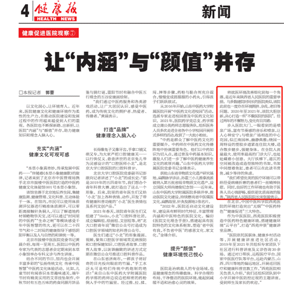 1月5日,继在全国健康促进医院优秀案例大会上做经验分享后,《健康报》以“提升颜值,健康环境悦己悦心”为题,对五楼自拍 健康医院环境改造进行报道。
