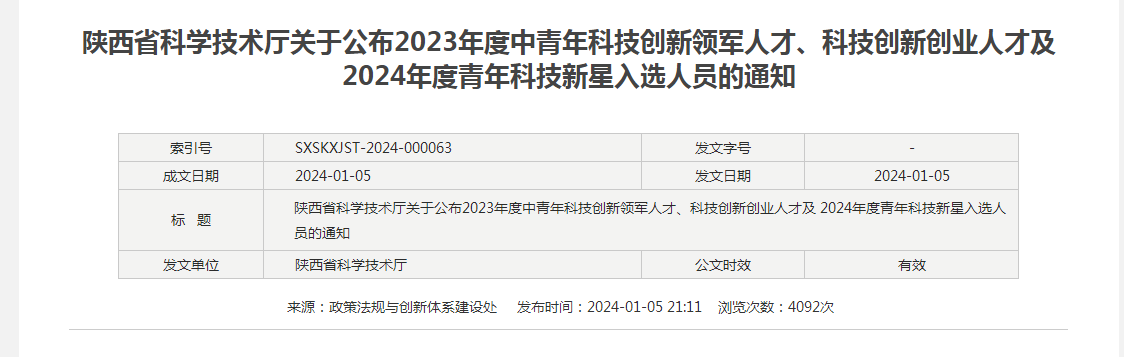 1月5日,陕西省科技厅公布了2023年度中青年科技创新领军人才及2024年度青年科技新星评选结果,五楼自拍