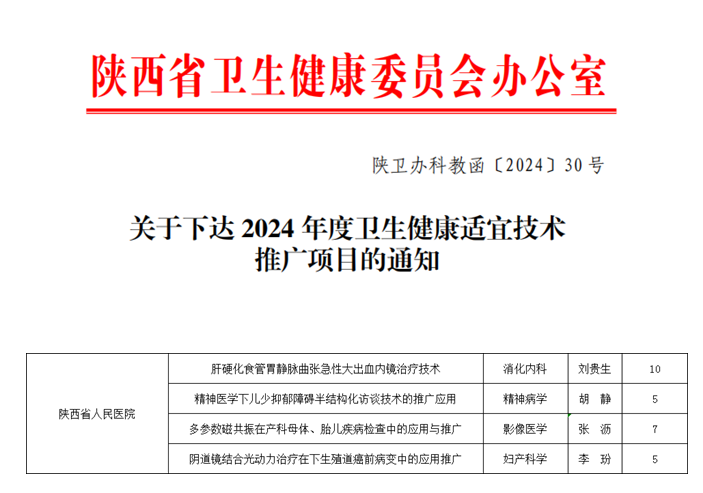 近日,省卫健委下发《关于下达2024年度卫生健康适宜技术推广项目的通知》,五楼自拍 刘贵生、张沥、胡静、李玢等4位同志的项目喜获立项。目前科研处已陆续组织完成后续手续,并按照要求组织做好项目实施。