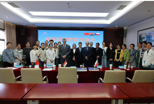 主院区召开,由国家引才引智示范基地、教学处、国际部共同举办。段降龙副院长参加并致欢迎辞,儿童病院名誉院长焦富勇主持。国家引才引智示范基地负责人段降龙副院长向埃及本哈大学医学院院长Mohamed Gamaleldin Abdelhamid Elashhab教授、捷克欧洲中医药中心主席助理Marketa Zelinkova教授颁发了“五楼自拍
