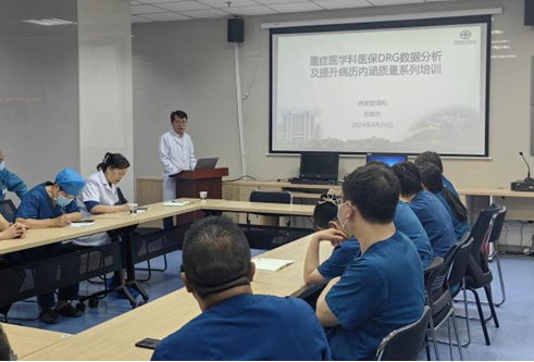 郑安丽总支书记表示,三级公立医院绩效考核指标是医院及科室高质量发展的重点工作,此次培训会将从科室2023年主要业务指标逐项分析,帮助科室找差距、理思路、定方法,助力科室四大指标提升。苏晓东科长重点分析了西安市医保费率及结算方式的调整和2023年重症医学科DRG运行情况,对病历书写标准质控指标及质控问题进行详细讲解,针对不同病种分别举例说明,要求大家须重视病案数据质量与病历书写,加强与病案室的沟通,保障数据的准确性,鼓励大家积极参加国家优秀病历评比活动。