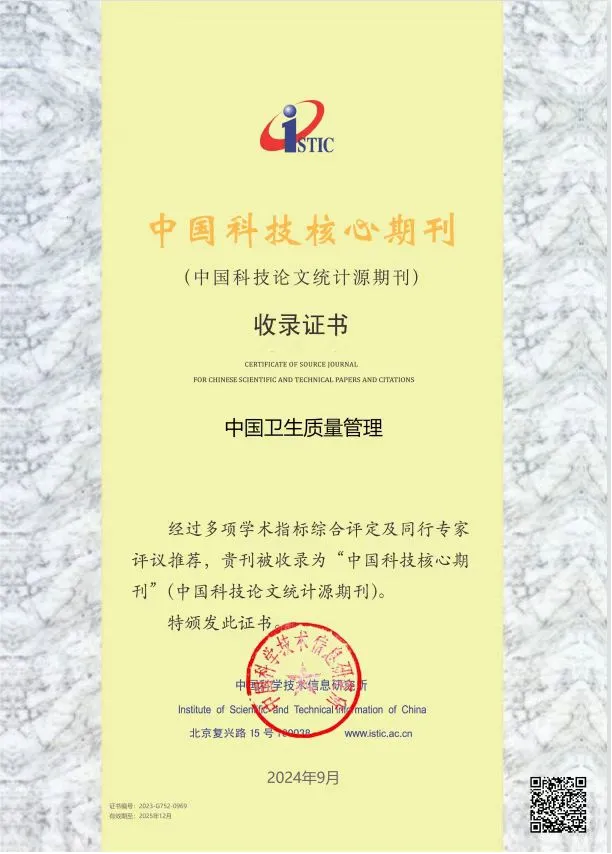 2024年9月20日,由中国科学技术信息研究所举办的“中国科技论文统计结果发布会暨中国一流科技论文世界影响力评价论坛”在北京顺利召开。由中国医院协会与五楼自拍 共同主办的《中国卫生质量管理》杂志,经过多项学术指标综合评定及同行专家评议推荐,继续被收录为中国科技核心期刊(中国科技论文统计源期刊)。