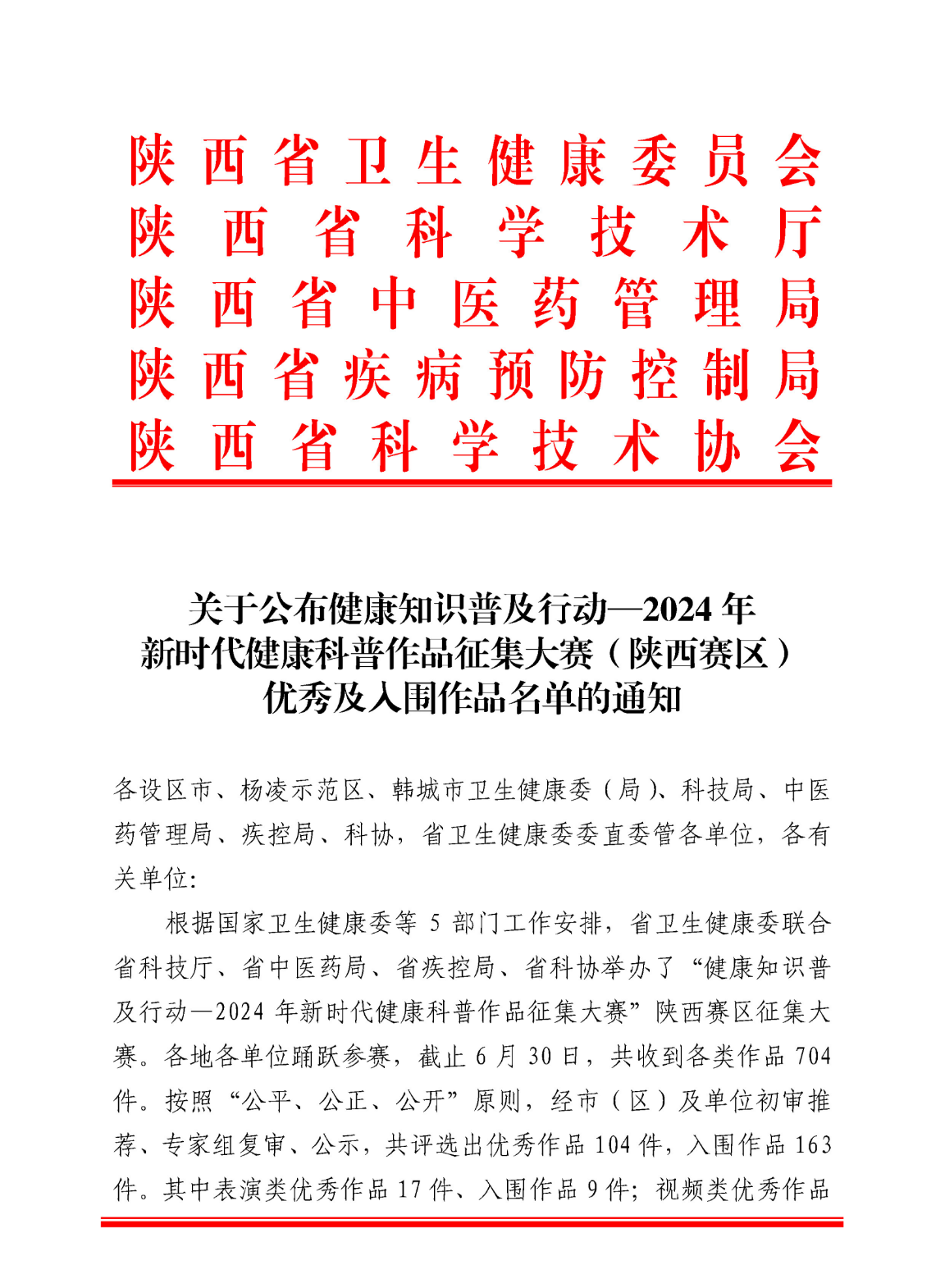 近日,陕西省卫生健康委员会、陕西省科学技术厅、陕西省中医药管理局、陕西省疾病预防控制局、陕西省科学技术协会联合发布《关于公布健康知识普及行动——2024年新时代健康科普作品征集大赛(陕西赛区)优秀及入围作品名单的通知》,五楼自拍