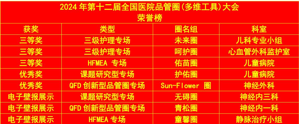 共有5个项目的团队参与决赛的现场汇报;3个项目的团队进行电子壁报展示。经过三天激烈的角逐,三级护理专场“未来圈”、“呵护圈”,HFAME专场“佑苗圈”分别荣获三等奖;课题研究型专场“护佑圈”、QFD创新型品管圈专场“Sun-Flower圈”分别荣获优秀奖;电子壁报展示入围团队为课题研究型专场“无碍圈”、HFAME专场“童鑫圈”、QFD创新型品管圈专场“青松圈”。