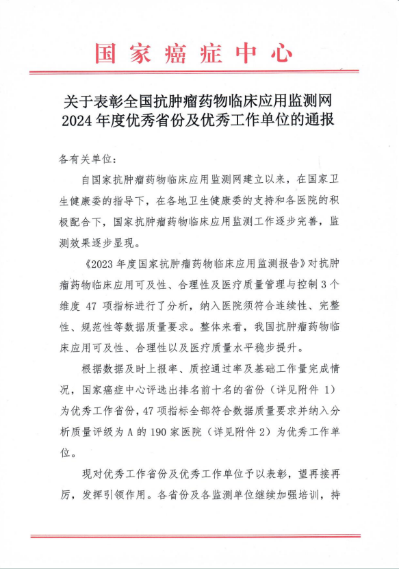 抗肿瘤药物临床应用监测工作获得了国家癌症中心的认可。