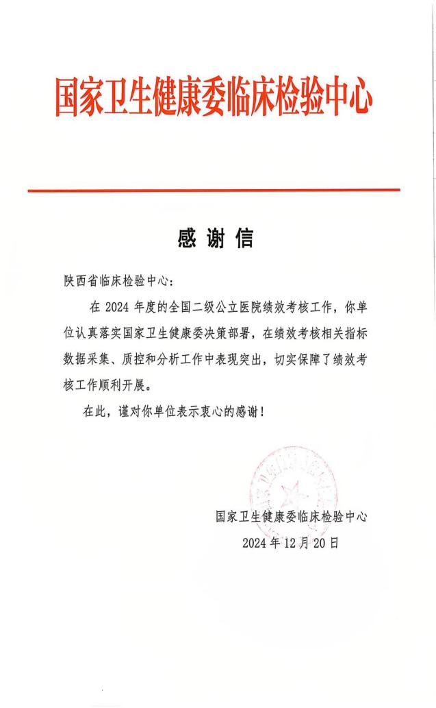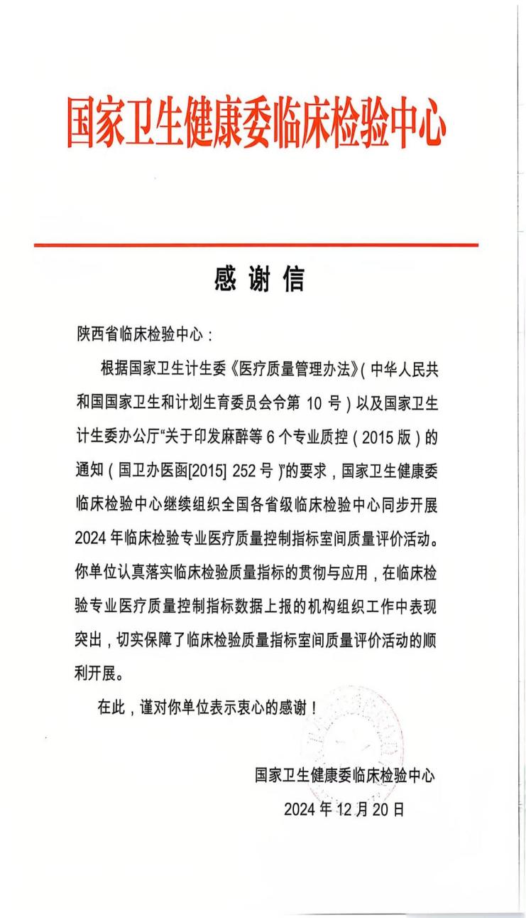 12月20日,五楼自拍 省临床检验中心收到国家卫生健康委临床检验中心发来的两封感谢信。信中对五楼自拍 省临床检验中心在临床检验专业医疗质量控制指标数据上报的机构组织工作以及全国二级公立医院绩效考核相关指标数据采集、质控和分析工作中的突出表现表示感谢。