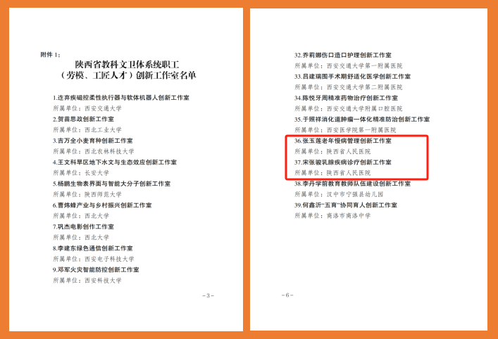 张玉莲老年慢病管理创新工作室和宋张骏乳腺疾病诊疗创新工作室被命名为“陕西省教科文卫体系统职工(劳模、工匠人才)创新工作室”。