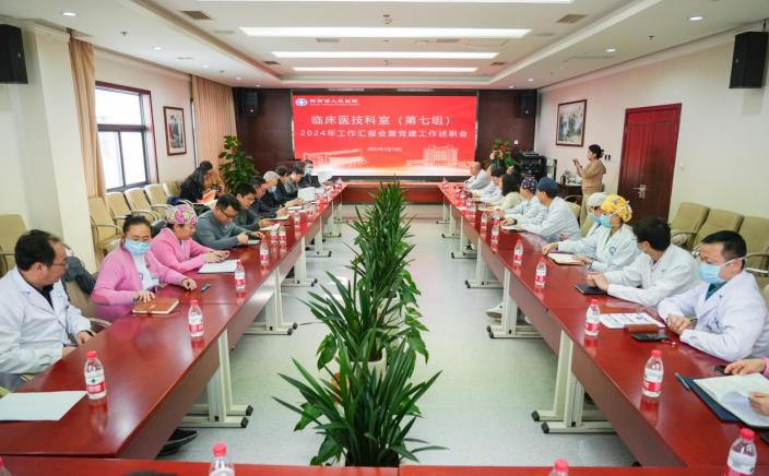 在行政第五会议室召开临床医技科室(第七组)工作汇报会暨党建工作述职会。中医科、针灸科、中心实验室、麻醉科、手术室正副主任、正副护士长、支部书记及A栋楼建设办公室、医学装备部、信息处、离退办负责人等共50余人参加,会议由米涛副院长主持。