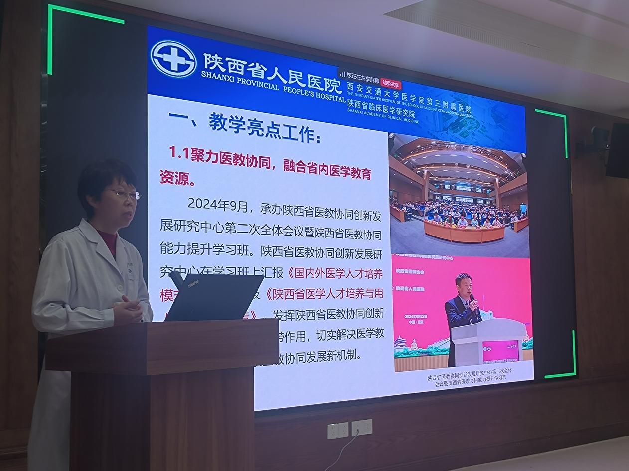会上,温红侠副处长对2024年教学工作进行了全面回顾,重点展示了四大亮点、四大重点工作。亮点工作一是发挥陕西省医教协同创新发展研究中心平台纽带作用,切实解决医学教育发展难题;二是重抓教学过程管理,提升教学质量;三是创新建立职能部门、专业基地、临床科室对话制;四是顺利通过省级复评,恢复5个专业基地的住培招生资格。重点工作一是圆满完成省卫健委下达的各项任务;二是21位专家被纳入省级评估专家库;三是师资能力提升明显,获得多项荣誉;四是组建医学模拟教学团队,开发临床模拟技能培训新课程。