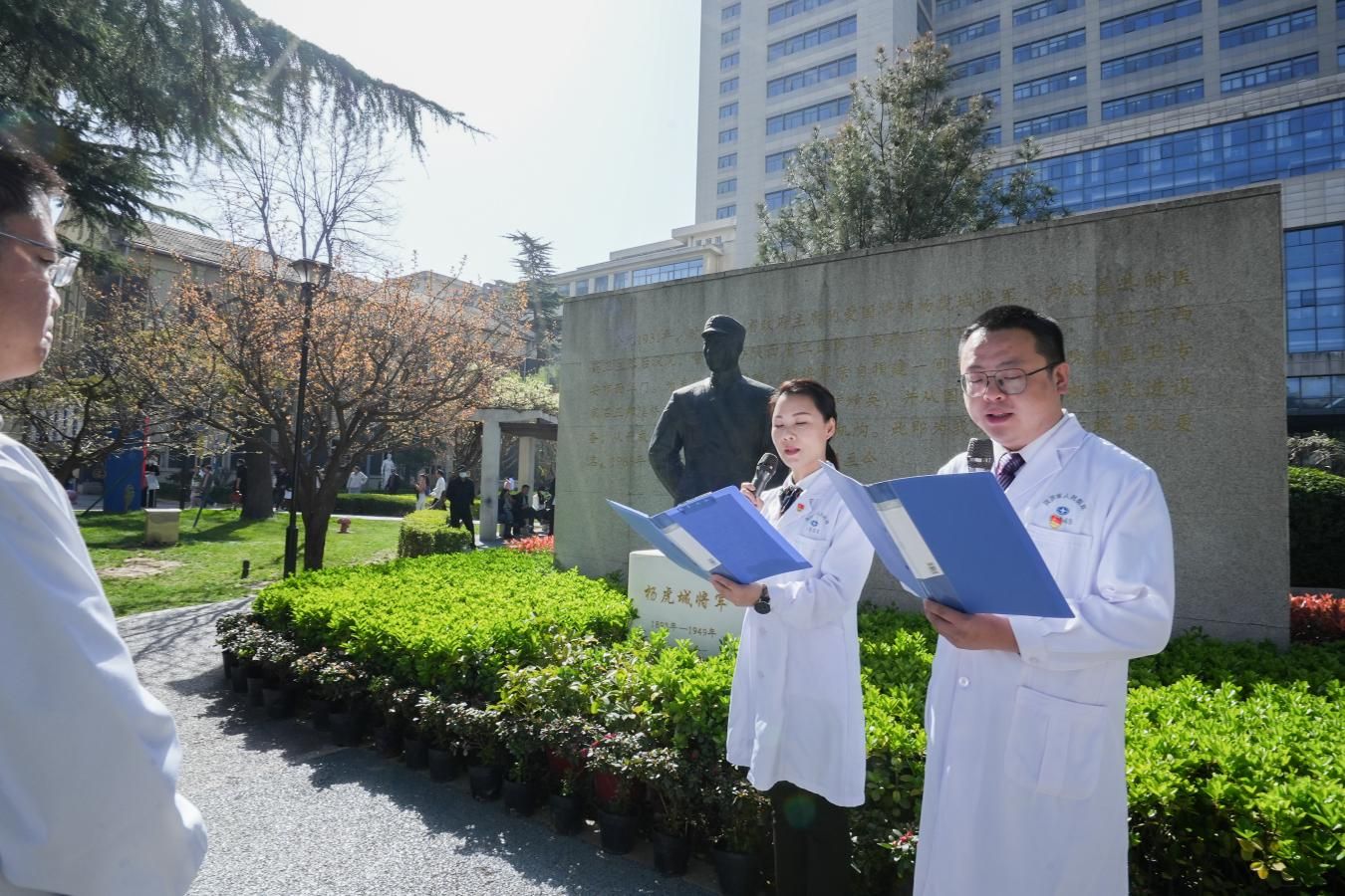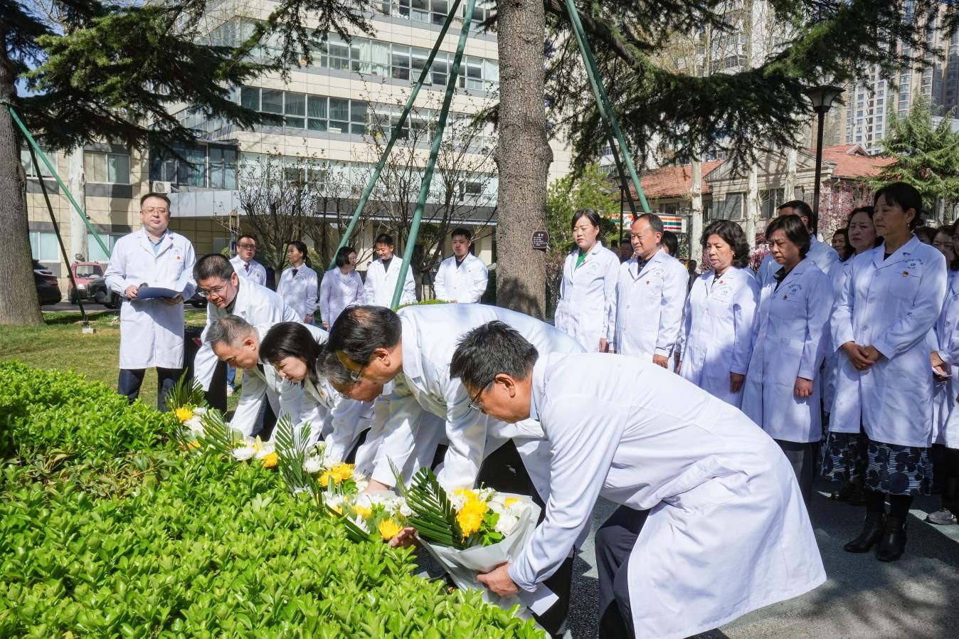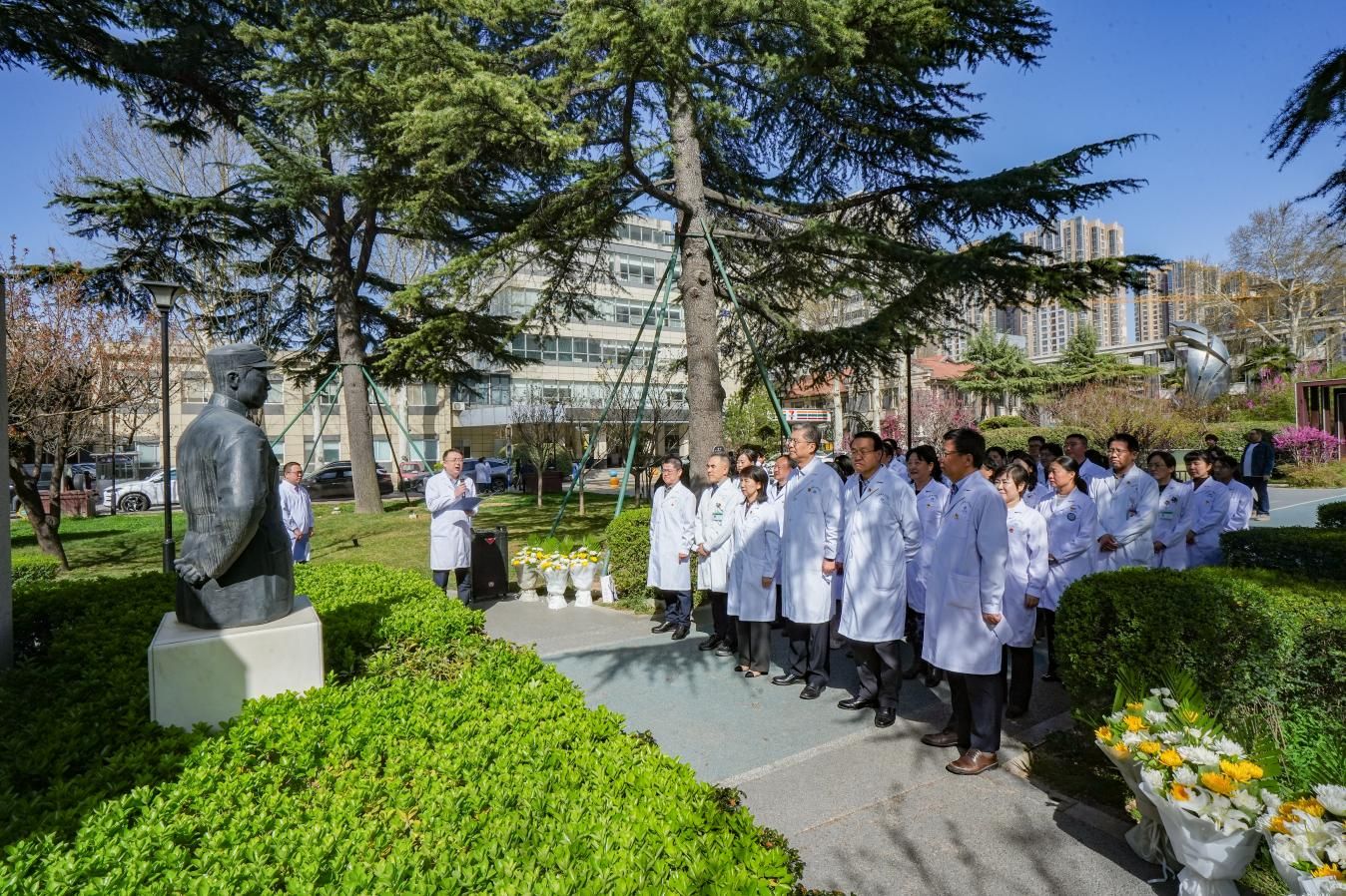 赋》,追溯医院从1931年建院到新时代“一院两区”发展的壮阔历程。献花环节,院领导班子成员缓步上前,将鲜花敬献于雕像基座,一束束鲜花寄托着对建院先辈的深切追思。全体人员集体鞠躬致敬,静默中传递着“健康所系、性命相托”的医者誓言。仪式全程庄重有序,展现了医院职工团结奋进的精神风貌。