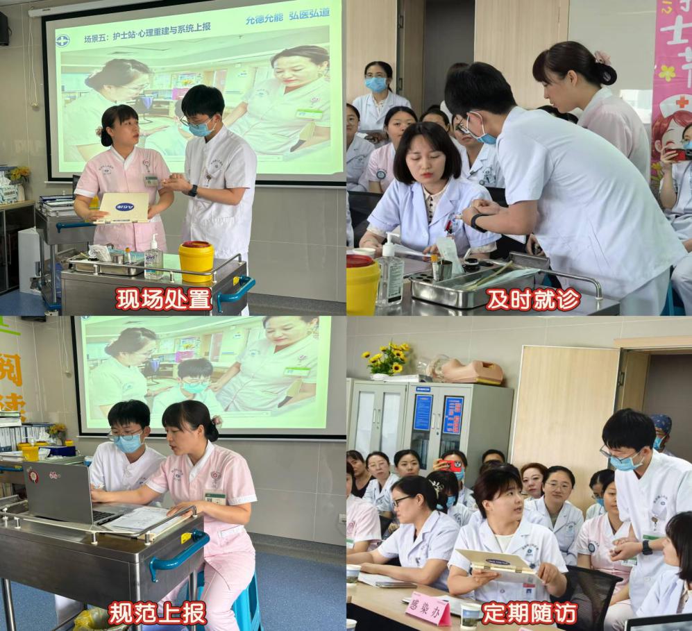 演练模拟了临床工作中常见的职业暴露场景,由妇科医护人员、皮肤科杨思璇医师、院感办晁娜主管护师配合完成。流程分为三个部分:一是以练为战、模拟真实场景。以常见的“锐器伤”为背景,模拟一名护士在为患者采血时发生梅毒针刺伤的场景,全程分为现场处置、及时就诊、规范上报、报告随访四个环节。二是以练促防、共筑安全屏障。医生展示了传染病手术正确着装规范、感染性医废处置方法、三种类型手套的使用场景。三是常用利器的使用及处置。工作人员现场讲解示范了利器盒的正确使用方法、单手针头回帽、蝶形针的使用及防刺伤演示等。随后皮肤科杨思璇医师为大家讲解了梅毒的相关知识及暴露后的预防用药。演练过程中,医护人员反应迅速、操作规范,多部门联动高效有序,展现了五楼自拍