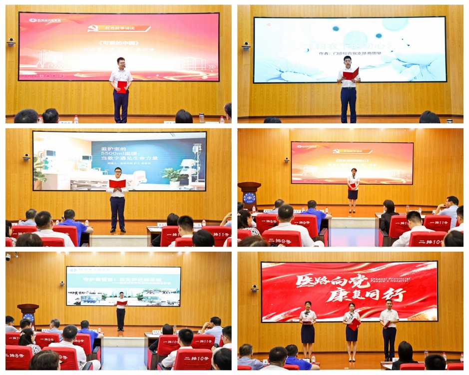 聆听红色故事,学习榜样精神,红色故事诵讲环节亮点纷呈。行政第八党支部李新冲深情诵读《可爱的中国》,带领参会人员感悟革命先烈的信仰力量;门诊综合党支部陈思攀《铅衣下的初心》,揭示介入医生用“血管里的导丝”淬炼党性、永葆初心的故事;急诊内科党支部易福田讲述《监护室的5500毫升温暖》,让监护仪曲线成为医者与群众血脉相连的见证。感染血管外科党支部闫燕、保卫处党支部陶海军、康复医学科党支部等带来的原创诵读,从不同视角诠释了“党旗下的白大褂”坚守人民立场、护卫生命健康的使命担当。凝聚先锋势力,攻坚克难筑牢“健康防线”。在党员突击队分享中,儿童病院党支部“创辉突击队”以创新开拓儿科医疗新领域;西院病区党支部“迷途知返、吞咽有道突击队”在康复征途中守护慢病患者的尊严。