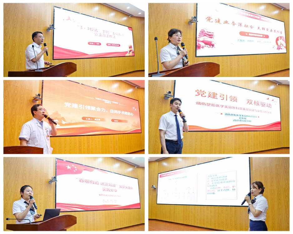 从党课中汲取奋进力量,于岗位上践行初心使命。在微党课环节,普外一科党支部党支部书记阎立昆展现了效率与仁心同频共振的手术管理新模式;烧伤医学整形美容外科党支部书记慕生枝讲述了先进榜样带领下重塑生命的使命担当。基层党支部是落实各级党委决策部署,践行服务群众初心使命的“最后一公里”。在优秀党支部工作法分享环节,神经内一科党支部书记胡军分享了“3+3模式”下的“五岗五融”工作法,以党建标准化建设推动学科攻坚;急诊内科党支部书记刘丹平以《党建业务深融合 先锋突击显担当》为题,诠释了急诊团队在急难险重任务中的速度与温度。