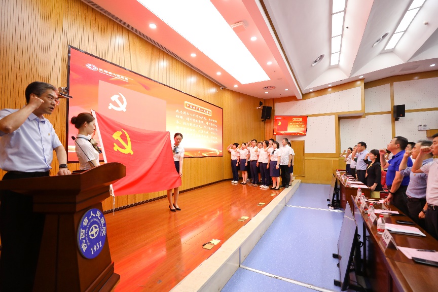 “我志愿加入中国共产党……”在党委副书记张路的领誓下,2025年度预备党员与全体党员共同重温入党誓词,铿锵誓言回荡会场,凝聚起“为共产主义奋斗终身”的坚定信念,大会气氛达到了高潮。“实验室里破译生命密码,手术台上挽救患者生命”,党员先锋岗颁奖词道尽临床一线党员的使命担当;“党旗所指,攻坚所向!”,党员突击队颁奖词彰显了先进党员学科、服务和科研提升中的铁军精神;“把支部建在学科前沿,把党旗插在创新高地”,标杆党支部颁奖词诠释了“省医党建样本”的深刻内涵。