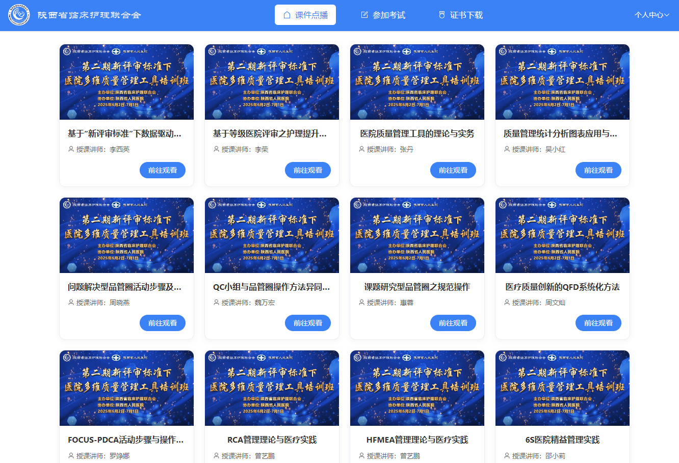 本次培训班立足临床迫切需求,对标新版医院评审标准,聚焦多维质量管理工具,精心设置系列课程,内容涵盖评审政策解读、管理工具概述、品管圈与QC小组、多维工具拓展和临床经验分享等多个维度。培训班采用线上培训的形式,共16个课程36个学时,并组织线上考试,考核合格者颁发培训证书。