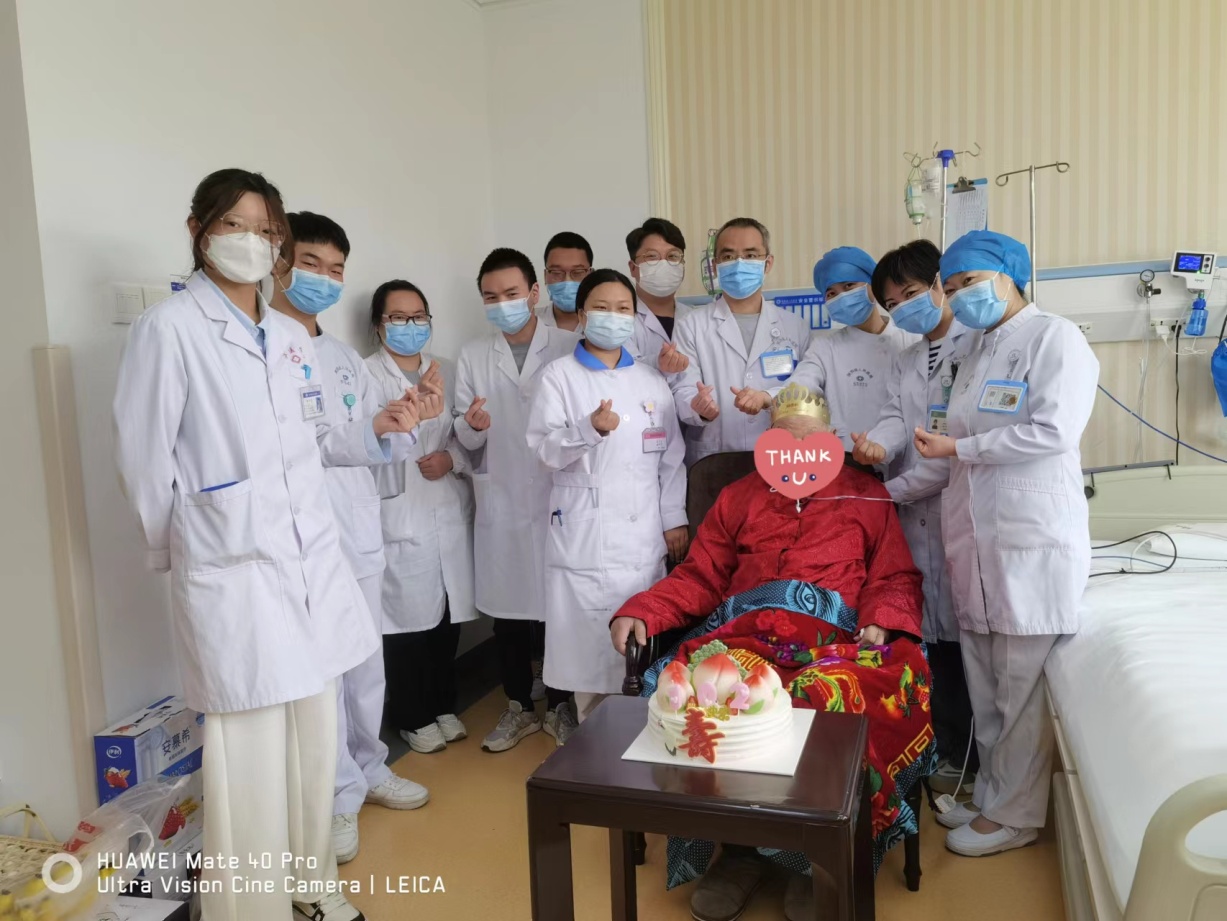 3月27日,西院一病区医护人员为102岁的高龄住院老人喜庆寿辰,共同向患者送上祝福。