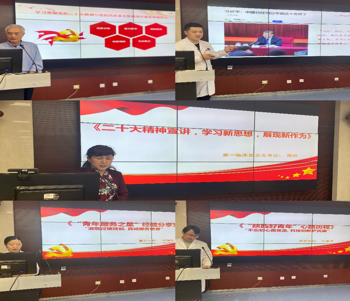 最后,第一临床党总支书记陈欣以《学习新思想,展现新作为》为主题进行学习贯彻党的二十大精神宣讲,要求大家要学习新思想,展现新作为,把学习贯彻党的二十大精神同学习贯彻习近平新时代中国特色社会主义思想有机结合起来,与医院工作结合起来,与科室的高质量发展结合起来,进一步理清思路、融会贯通,加强学习成果转化,提升服务能力,踔厉奋发,在传承创新中谋求高质量发展,为医疗卫生事业、健康陕西建设作更大贡献。