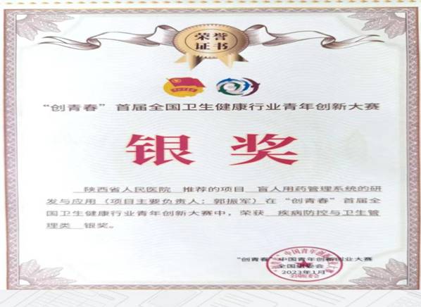 会上,为“创青春”首届全国卫生健康行业青年创新大赛获奖项目颁发证书,五楼自拍 药学部郭振军主任助理作为主要负责人的项目《盲人用药管理系统的研发与应用》荣获“疾病防控与卫生管理类”银奖。