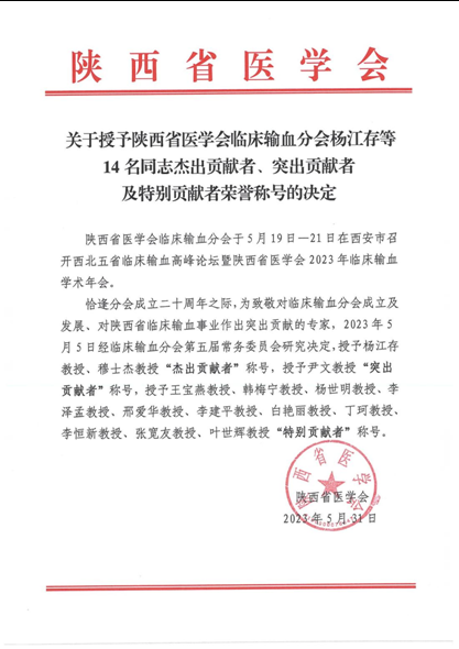 勇于担当、锐意进取是您的做事风格,20年前,您以强烈的责任心和使命感,以改变陕西输血现状为己任,在全国率先发起成立陕西省医学会临床输血分会,开省级输血分会之先河,为临床输血工作者提供了一个学习交流,提高进步的平台。无数思想的火花和实干的案例在这里得到推广和延伸,让陕西省的临床输血科研,无偿献血工作走在了前列。你是第一、二、五届主任委员,20年来,您带领陕西输血人脚踏实地、敢为人先,创新性地完成了多项输血行业领先项目,为推动陕西省输血事业乃至全国输血行业发展做出了突出贡献,在陕西省医学会临床输血分会成立20周年之际,您被陕西省医学会授予“杰出贡献者”称号。