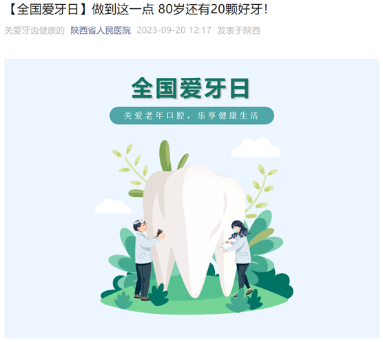 ”微信公众号平台发布了2篇爱牙科普文章,分别介绍了老年人如何预防牙周炎,如何进行牙周炎的诊治,以及老年人拔牙要做哪些准备,帮助公众不断提高口腔健康素养水平。除每一年固定的爱牙日系列活动外,口腔科还定期在抖音和微信视频号推送科普短视频。