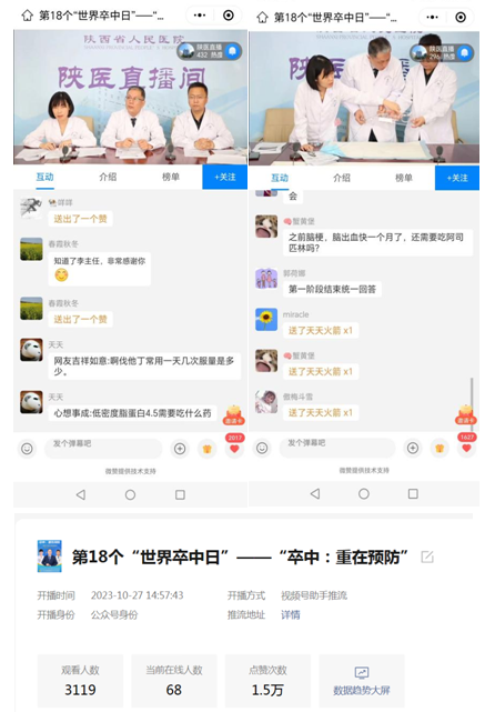 2023年10月29日是第18个“世界卒中日”,今年的主题是——“卒中:重在预防”。为了让更多的老百姓了解脑卒中,重视脑卒中预防,熟悉脑卒中早期识别方法及治疗知识,10月27日下午,神经内二科开展了脑卒中防治知识线上直播科普活动,线上观看人数达3119人,点赞数1.5万,受到了网友的广泛赞誉。