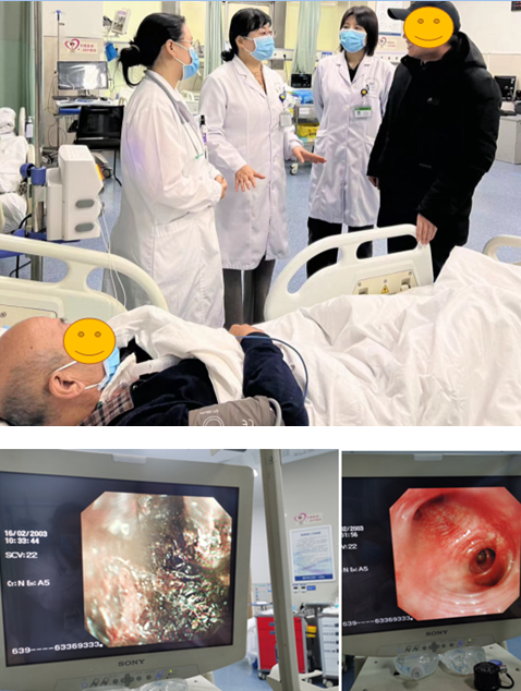 患者为喉癌全切术后、气管切开造瘘术后、食道狭窄支架术后,支气管出血致血痰、血痂阻塞大气道。、来院时呼吸困难明显,端坐呼吸,大汗淋漓,三凹征,且生命体征不平稳,心率约150次/分,呼吸45次/分,血氧75%,听诊呼吸音低。考虑患者存在大气道梗阻,紧急联系呼吸与危重症内一科、耳鼻咽喉头颈外科会诊,经会诊评估后考虑患者生命体征不平稳,不敢轻易给予介入性的操作,故考虑完善胸部+颈部CT评估气道情况。了解情况后完善进一步治疗,与家属沟通,家属理解后完善检查,完善CT后阅片,可见气道造瘘口及造瘘口下段异物阻塞,急诊内科王会强主治医师与腔镜中心联系,调用支气管镜及功能检查科护理人员,联系呼吸与危重症内一科王贵佐副主任医师、耳鼻咽喉头颈外科杨启梅主治医师、共同于急诊内科抢救室床旁给予患者行支气管镜下大气道异物取出,过程中可见痰痂碎屑,难以嵌夹,气管吸痰亦不能吸出,重新评估后给予糜蛋白酶注射液湿化,同时气管吸痰及气道造口嵌夹出大块血痂,患者梗阻症状解除。继续支气管镜检查气道,可见气道痰液、出血,给予镜下吸痰,止血后结束。
