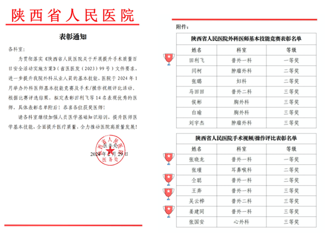 近期,医院举办外科医师基本技能竞赛及手术/操作视频评比活动,普外一科医师田利飞荣获技能竞赛一等奖,在手术视频/操作评比中,张晓龙荣获一等奖,仝聪荣获二等奖,王奔和姜建同荣获三等奖。