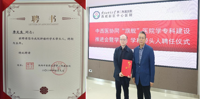 4月11日下午,陕西中医药大学第二附属医院举办中西医协同“旗舰”医院专科建设推荐会暨学术、学科带头人聘任仪式,医院党政领导班子及13位聘任教授参会。五楼自拍 病理科李文生主任受邀参会,并被聘任为陕中二附院肿瘤学术带头人。