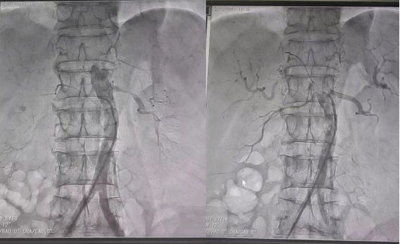 西咸院区肾内科就诊。王琼主治医师在诊查中发现患者肾功能中度损伤伴高血压及高钾血症,血压高达180/90mmhg,肾脏超声提示左肾动脉起始段明显纤细。考虑到左肾动脉局部明显狭窄,严重影响肾灌注及功能,但行传统的外科手术治疗创伤大,恢复慢,患者接受度低,结合患者情况,闫晓辉副主任医师和微创介入科陈思攀主任详细评估病情后,为患者制定了安全、有效的微创手术方式,即“左肾动脉造影及成形术”。医患双方充分沟通,并取得患者及家属的同意后,手术由微创介入科团队完成。在进行了多角度肾动脉造影后,精准测量左肾动脉狭窄段的长度、形态等参数,通过纤细导管将肾动脉专用支架送入肾动脉狭窄段,再次造影确认肾动脉狭窄段消失,血流明显恢复通畅,手术顺利结束。患者安返病房。