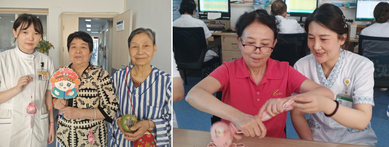 活动中,中医科护士长李婷以《夏季养生》为题,向科室患者及家属朋友们介绍了端午节习俗如吃粽子、挂艾草、薰苍术等与中医养生、保健的关系,以及中医护理在端午节期间的特色服务和养生建议,并向大家宣讲了中药香囊和端午灸疗法等项目,以满足患者的中医特色节日服务需求。随后,医护患共同体验制作艾锤及手绘团扇等节日特色手工艺品,并在护士的讲解下制作端午中药香囊。还邀请前来参与活动的朋友品尝了科室精心熬制的酸梅汤,解暑开胃,生津止渴,补气安神。