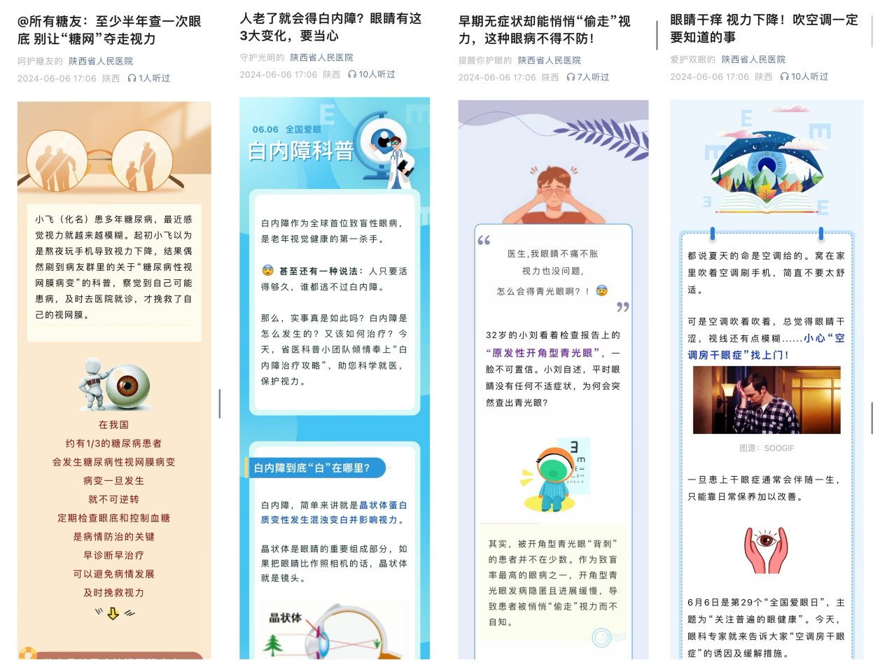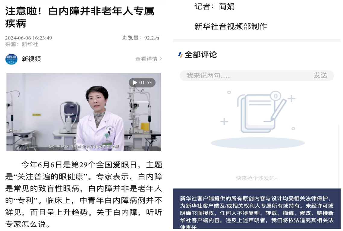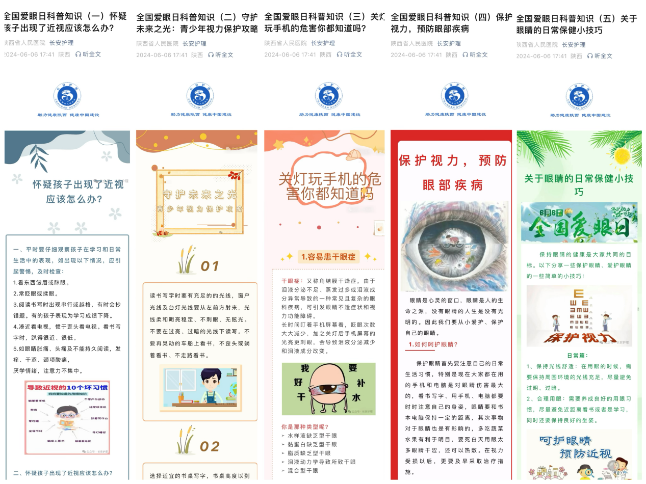 开展全人群、全生命周期的眼健康科普线上宣传,内容包括眼科专家科普视频、医疗科普文章和护理科普文章。眼科专家就青少年近视、干眼症、青光、白内障和糖尿病视网膜病等多个全生命周期常见眼病进行了疾病科普。专科护士从青少年近视防控、保护攻略、关灯玩手机危害、预防眼部疾病的方法及眼睛的日常保健小技巧五个方面,积极推动护理科普的实践。为了让公众更直观地了解白内障的相关知识,周海燕副主任还制作了一个科普视频,通过生动讲解和图示向公众普及了白内障并非老年人的专利。该视频被新华社特别报道,浏览量近100万。