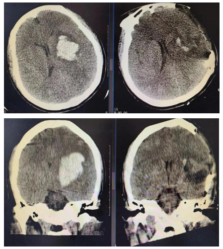 患者为44岁女性,因“突发意识不清7小时”入院。来院后行颅脑CT平扫示左侧基底节区脑出血,量约42ml。患者意识呈浅昏迷,颅内出血量大、血肿位置较深、中线偏移明显。根据临床表现,行全面检查,并充分评估,患者行神经内镜手术指征明确,无禁忌症。李帅医生于当天夜里第一时间紧急指导县医院神经外科团队为患者在全麻下行神经内镜辅助下颅内血肿清除术。手术过程顺利,术后患者生命体征平稳,复查颅脑CT平扫可见血肿清除满意,止血良好。