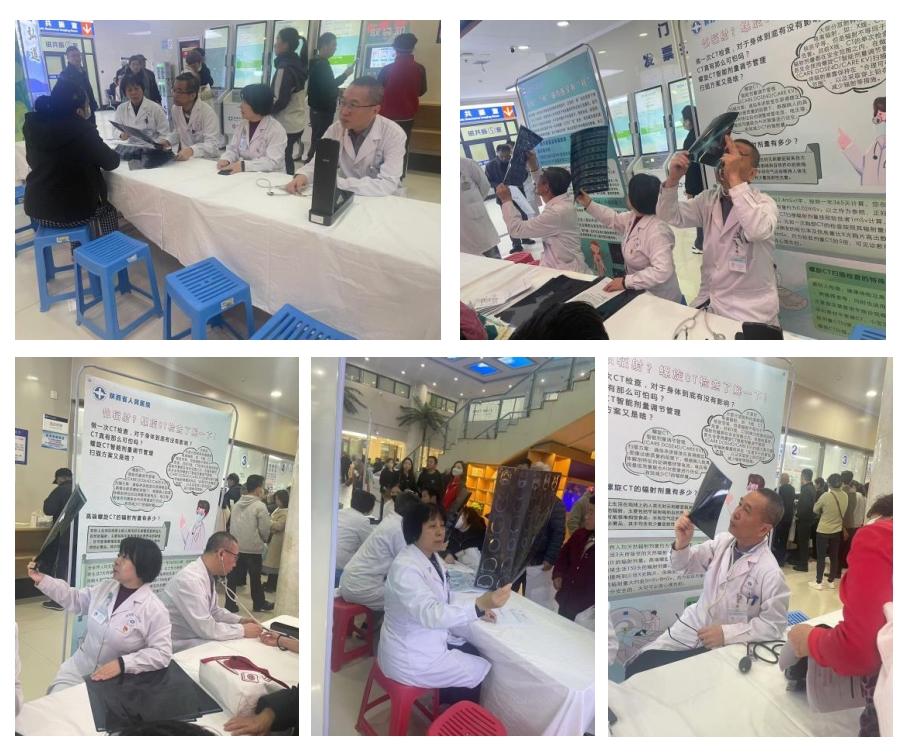 活动内容包括:1)为患者免费提供测量血压服务;2)磁共振室开展以“别怕,核磁共振没有核”为主题的科普活动,向患者说明磁共振是没有辐射的,对身体也是没有伤害的;3)CT室开展以“现代高端螺旋CT的辐射剂量到底有多少?”为专题的问答活动,“剂量”这一患者关心的问题在活动现场也得到了解答;4)黄明刚主任、雷晓燕主任、张艳主任、刘辉主任在活动现场为就诊患者进行了一对一阅片服务;5)张鑫技师长向患者简单讲解了X线、CT、MRI是如何进行扫描检查、如何获取图像、医生如何诊断的整个检查流程。