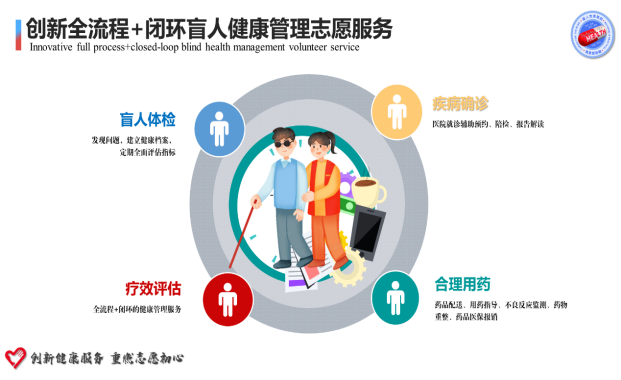 药学部在2018年创新开发,至今已坚持了6年。团队通过创新性地设计制作盲人专用的合理用药系统,填补了国内在盲人用药安全、准确、依从性方面的空白。针对盲人群体的特殊需求,开展了盲人体检、陪诊、用药指导、药品配送等一系列针对性强、效果显著的志愿服务活动,极大地提升了盲人群体的健康水平。习近平总书记指出:“志愿服务是社会文明进步的重要标志”,并强调“要大力弘扬奉献、友爱、互助、进步的志愿精神”。该项目正是在这一精神指导下,将志愿服务与专业医疗相结合,为盲人群体提供了全方位的健康管理服务,体现了社会主义核心价值观的实践要求,彰显了新时代青年的责任感和使命感。