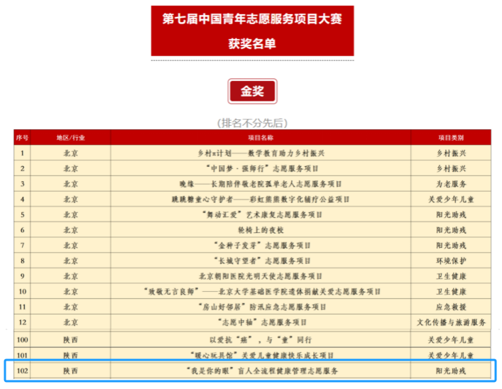 第七届中国青年志愿服务项目大赛共有1001个项目入围全国赛终评。其中,排名前501的项目通过线下路演答辩,评委、监委线下集中评审的方式进行了评审和交流。经过评审,《我是你的眼-盲人全流程健康管理志愿服务》等151个项目获金奖,350个项目获银奖,500个项目获铜奖。全国赛终评答辩路演现场,来自全国各地的项目团队通过精彩纷呈的路演带来了一个个好项目、讲述了一个个好故事,令人动容;评委老师认真倾听、仔细查看材料,进行深入浅出的专业指导;比赛引人思考,大家互学互鉴,共同汇聚成一场项目展示、交流、学习的志愿盛会。