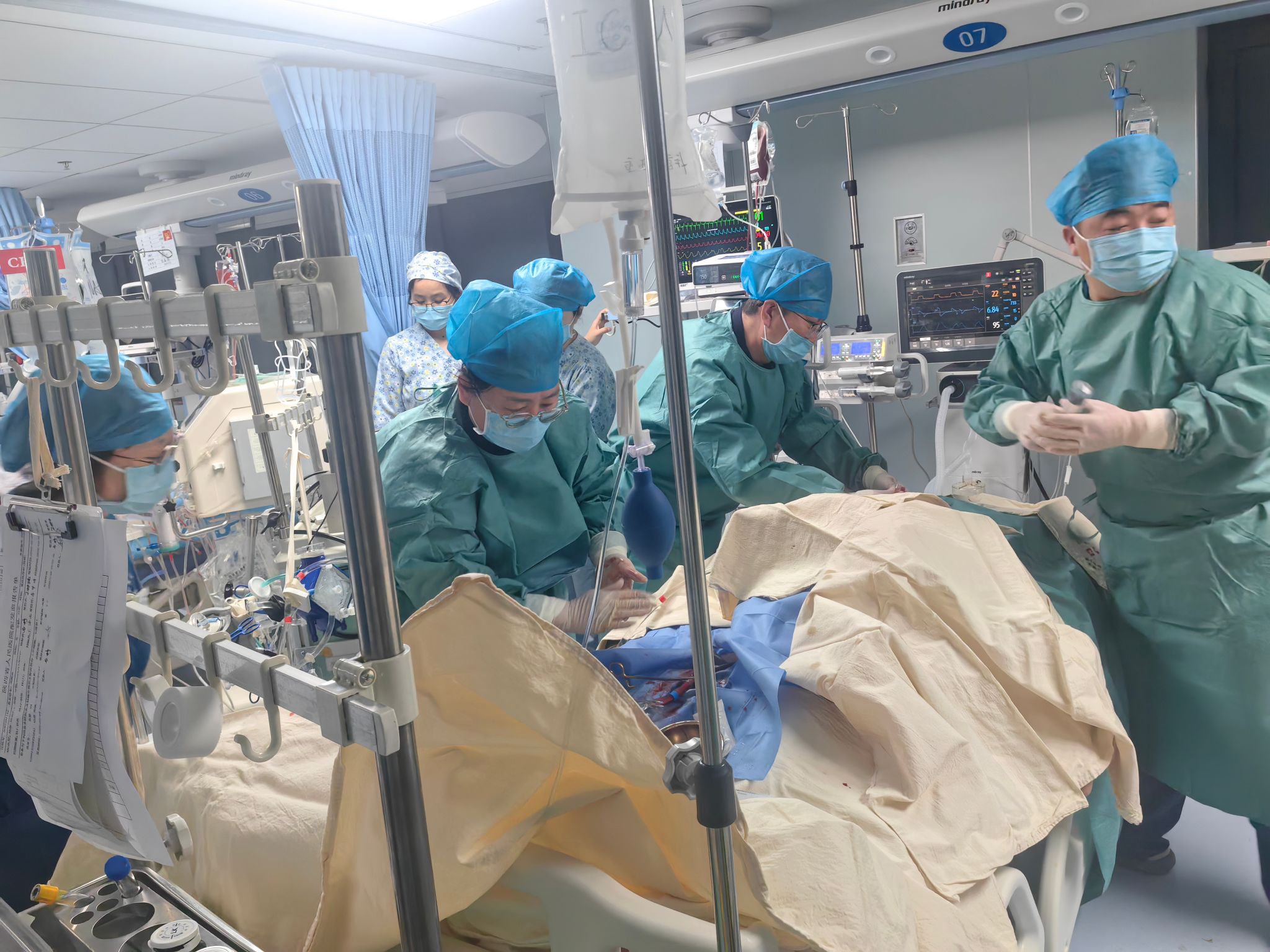 “患者张某,男性,63岁。3月2日,因间断双下肢水肿3年,加重伴发热4天入住呼吸科,3月6日病情急转直下,恶化迅速。紧急气管插管后,患者被转入西咸院区重症医学科接受进一步治疗。7日凌晨,患者氧合情况急剧下降,即便将呼吸机参数调整至氧浓度100%,指脉氧饱和度却仅维持在88%。医护团队迅速采取俯卧位通气治疗,但情况并未得到改善,每一秒都关乎生死。