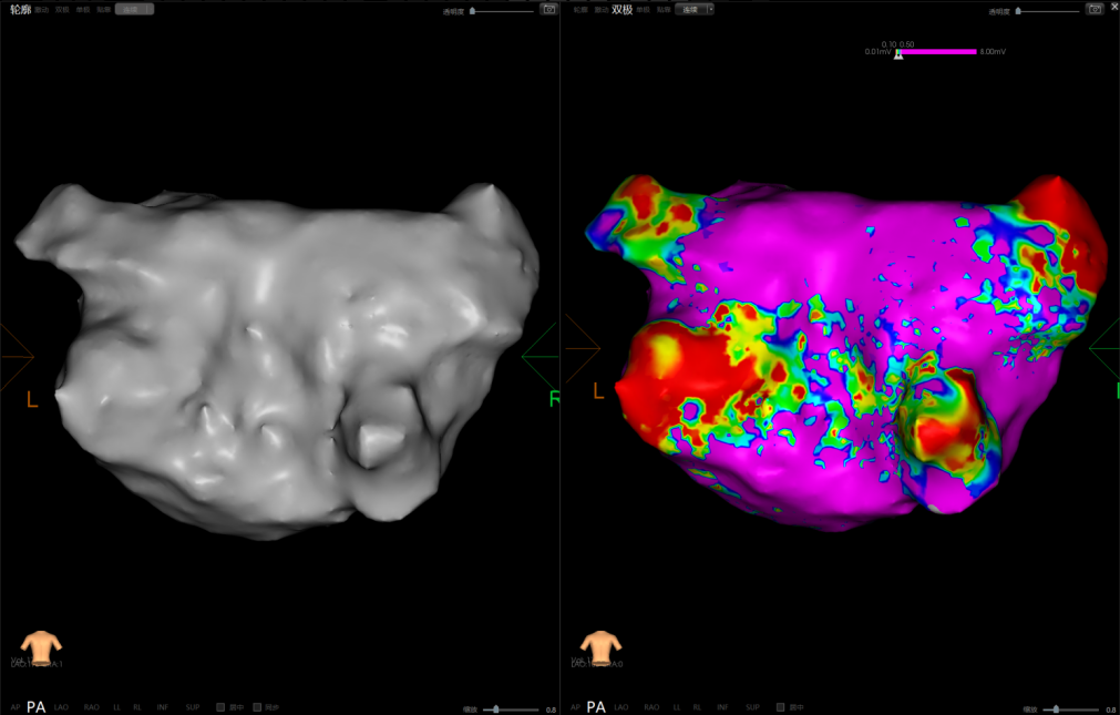 手术在介入导管室的通力配合下进行,姜馨主任、薛建颖主治医师、刘成峰医师密切配合,术中通过右侧股静脉送入心腔内超声(ICE)至右心房,排除左房血栓后成功指导精准房间隔穿刺,沿可调弯鞘管送入锦江心脏脉冲电场消融导管至左房,构建左房三维解剖模型并行基质标测,标测显示左房基质尚可,分别行左侧、右侧肺静脉消融。消融参数:1800v、400ms、400μs,共放电消融148次(消融左上肺静脉时转复为窦性心律),验证双肺静脉均隔离。术后重新标测显示所有肺静脉均已急性阻滞,消融效果理想,肺静脉前庭损伤范围也达到了预期的标准,同时ICE监测未见明显心包积液。手术仅用时30分钟,时间明显缩短,手术过程精准高效。术后患者恢复情况良好并顺利出院。术后1月复查心电图提示窦性心律,心脏超声提示心脏较前明显缩小,收缩功能明显改善,射血分数由25%提升至40%,心功能标记物NT-proBNP 恢复正常,仅54pg/ml。